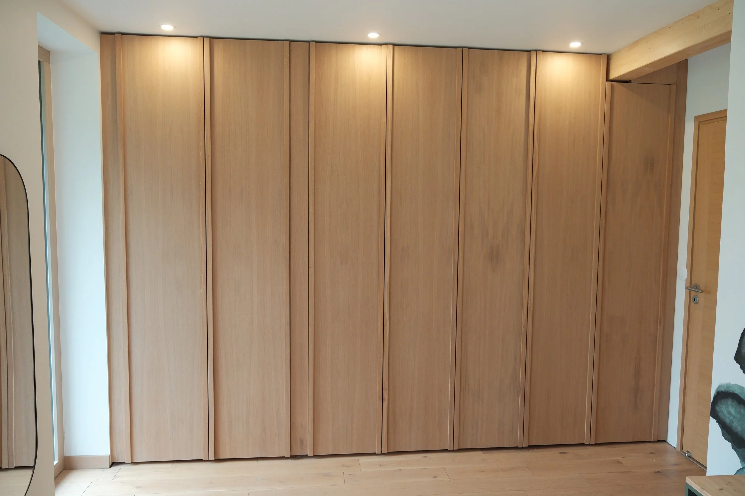 Le défi de ce projet était de taille : intégrer un dressing complet dans un espace sous escalier, sans que rien ne trahisse la pente irrégulière qui se cache derrière. La réponse : des portes toute hauteur en trompe-l'œil, du sol au plafond, qui donnent l'illusion d'un mur parfaitement uniforme.