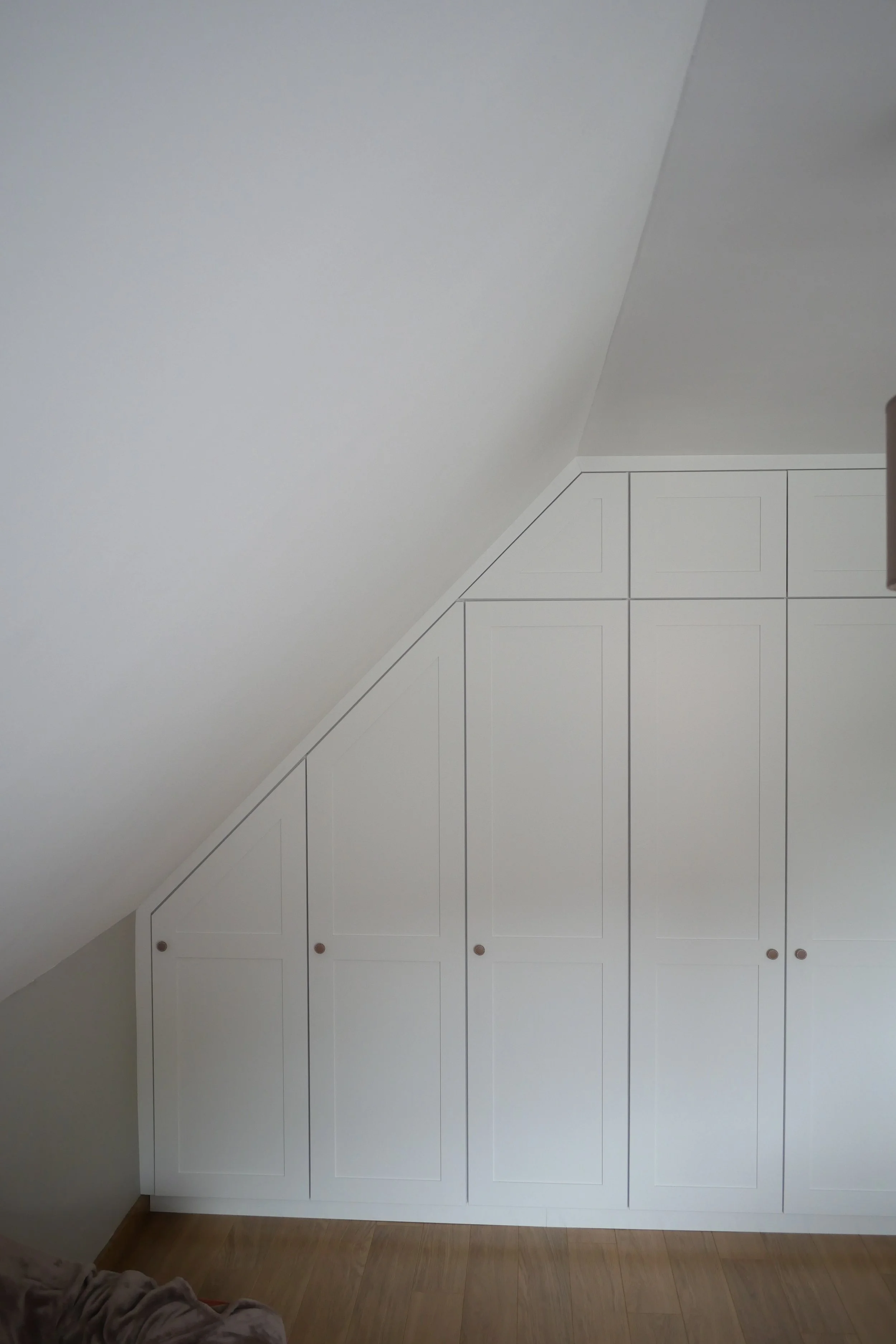 Ce dressing sur mesure a été conçu pour tirer parti d’un espace en angle et sous pente, transformant une zone difficile à aménager en un rangement élégant et fonctionnel.
